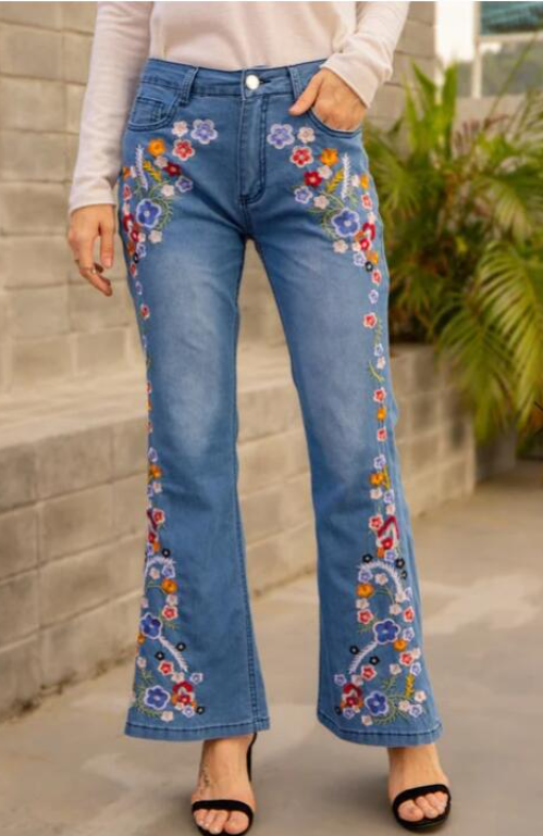 Women's flared jeans in denim wash with floral embroidery. Button closure. Looks great paired with a basic or dressy crop top.