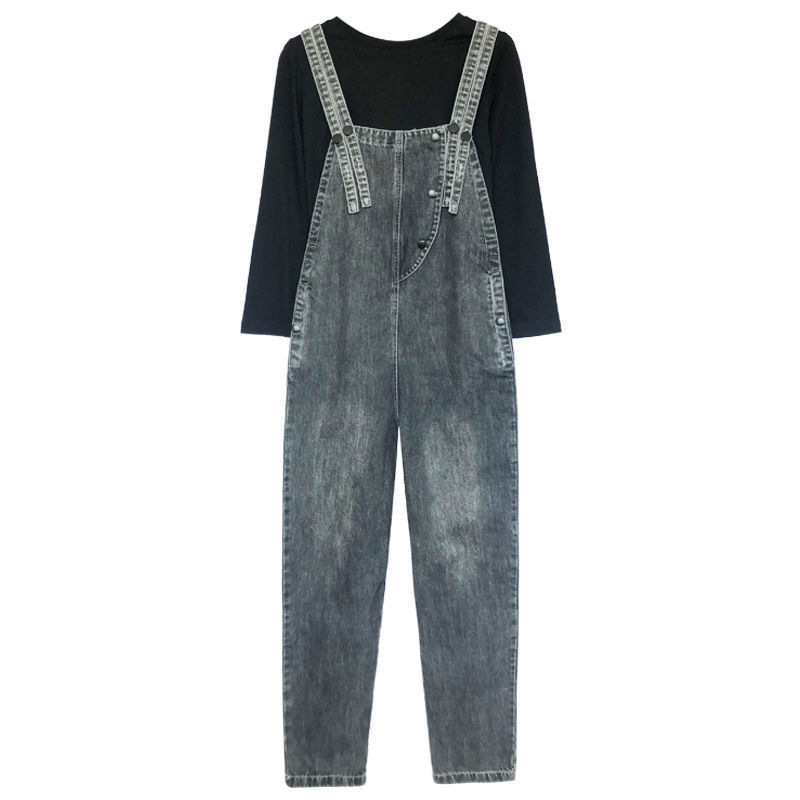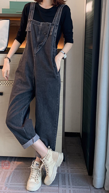 High-waisted, loose-fitting work clothes for women with adjustable shoulder straps.