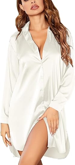 Unique Boyfriend Style sleepshirt, 34 sleeve, notch collar, button down, solid color, with good cut and irregular high-low hem, loose fit & great length to make you relaxed and attractive.100% polyester, high-quality satin fabric, meets washing requirements, is not easy to wrinkle, shrink or fade during washing, is soft, lightweight, durable, skin-friendly and breathable, suitable for year-round wear.